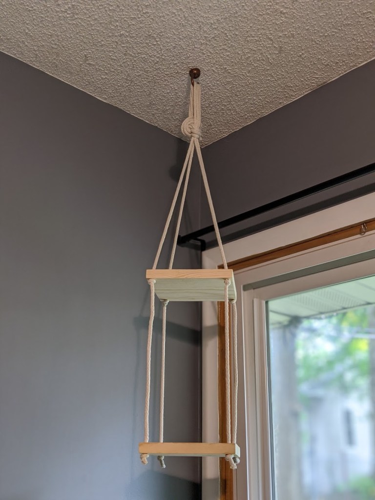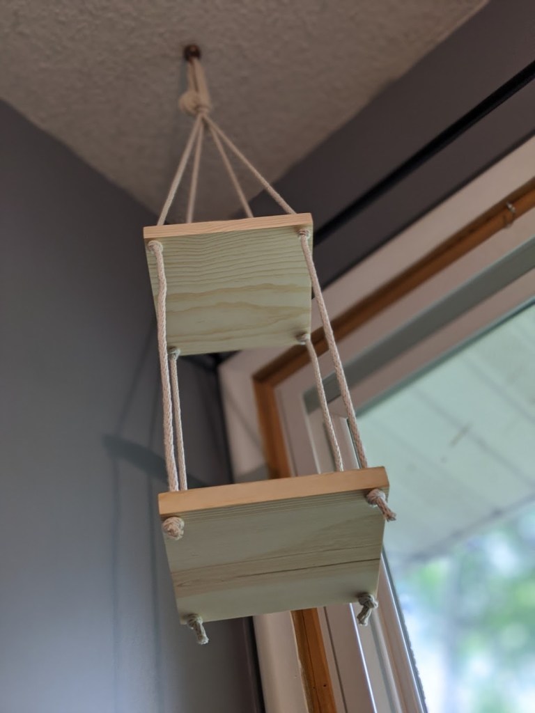One wood plant hanger (hanging shelf) with two shelves great for showcasing your favorite plants, trinkets, or other miscellaneous things!